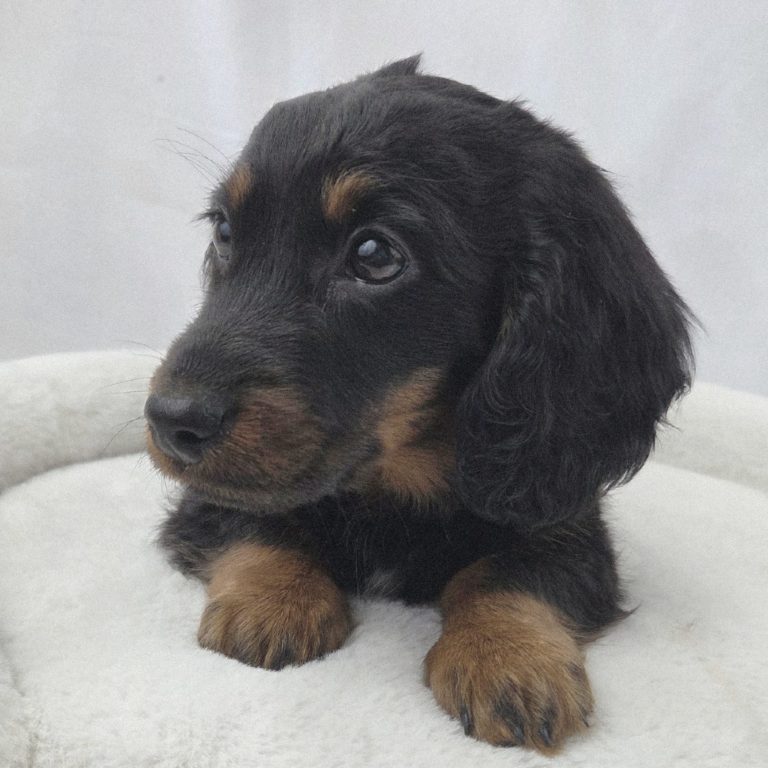 Helmut ist ein Langhaar Zwergdackel in der Farbe Black Tan.